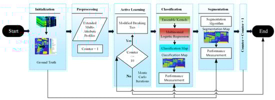 The hyperspectral image classification and segmentation tasks are related problems. The goal of image classification is to assign a class label to each pixel in the hyperspectral image whilst segmentation refers to the partition of the set of image pixels into the collection of sets. These sets are declared regions where the pixels in each set are close to each other in some sense. Notably, the term classification is used when there is no spatial information taken into account. On the other hand, the term segmentation is used when spatial prior information is being considered. Let P is a set of n pixels of HI as given by . Similarly, where M is a set of integers consisting of dataset labels. Further, let X is a set of d-dimensional vectors of image pixels represented as . Y is shown below as the set of labels for a dataset . The purpose behind this problem formulation is to classify each pixel and assign them their best label and also segment them into different regions based on labels for pixel [28]. The flow chart for the proposed methodology, namely the hybrid learning system (HLS), is presented in Figure 1. After training on AL-based samples, posterior probabilities were generated by a generalized composite kernels algorithm. On these probabilities, the maxim-a-posteriori algorithm was employed to find the best class probability/label against each training sample. On these classification labels, an α-expansion algorithm is run to generate the segmentation map. Generally in classification, spectral–spatial kernels are computed over a sample with its immediate and farther neighbors to assign it the probabilities, but in segmentation, the best label is assigned based on immediate neighbors. We have used two datasets to conduct our experimentation. Initially, each dataset is passed to extended attribute profiles (EAPs) for the components’ selection. After selecting the components, the MBT algorithm was applied for AL and multinomial logistic regression is applied for unlabeled HI data. Then, the output from multinomial logistic regression is used for segmentation. The method is iterated over ten Monte Carlo runs to get optimal results.
