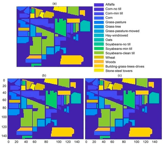 After classification, the MAP estimation was passed to the segmentation algorithm, where the MLL algorithm was used for segregating the classes. Here, different accuracy measures were tabulated for each class corresponding to AL methods, namely RS, ME, MI, MB, and MBT. The classification results in terms of overall for all these AL techniques, in the case of the Indian Pines dataset, varied from 98.13 to 99.93%. The Indian Pines ground truth is pictorially shown in Figure 3a, while the classification and segmentation pictogram are shown in Figure 3b,c, respectively. These results may be compared subjectively based on the perceptual information within the original images shown in Figure 3a. The quantitative performance of classification and segmentation is illustrated in Table 1 and Table 2 for Indian Pines. The results were outstanding for classification for the Indian Pines dataset as shown in Table 1, having OA, AA, and kappa statistics as 99.93, 99.86, and 99.84%, respectively. Whereas for segmentation, each of the performance measures (OA, AA, and kappa) have been found as 99.98%, as shown in Table 2. For classification, most of the past methods were based on the exploitation of spectral information [50]. Researchers having similar thoughts relied on the fact that single spectral information is enough for better classification [14,51,52]. These extracted spectral features, representing independent characteristics, were fed to the classifier without using the spatial information in contiguous pixel dependency. Tarabalka et al. [53] addressed the solution of this issue, that exploitation of the spectral information only is not enough for classification. Spatial information should incorporate with spectral information for better results [15,30,32,54,55,56,57]. Li et al. [28] have also shown the importance of spatial information with spectral information. Jain et al. [58] have elaborated hyperspectral image classification with a combination of SVM using self-organizing maps (SOMs). This technique is divided into two phases; the first one is based on the training of the SVM using SOM, while the second is based on the calculation of probabilities by finding the interior and exterior pixels, so the best label should be decided based on an optimal threshold. The comparison of existing techniques using the Indian Pines datasets is shown in Table 3 (Section 3.2).