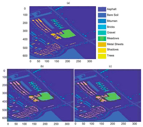 In the Pavia University experiment, the pictorial representation of ground truth, classification and segmentation landscapes of our proposed methodology are shown in Figure 4a–c. The representation of nine classes, i.e., asphalt, bare soil, bitumen, bricks, gravel, meadows, metal sheets, shadows, and trees, have been used to produce the ground truth. Every class with separate color can be seen after the application of the algorithm. Similar to the previous experimentation, empirically found number of samples using different active learning algorithms are computed by ten independent Monte Carlo runs. The classification results of each class are shown in Table 4 as OA, AA, and k-statistics as 99.14, 98.56, and 99.01%, respectively. The segmentation results in tabular form are illustrated in Table 5 for different active learning strategies. The segmentation results of the proposed methodology for the Pavia University dataset are: (OA, AA, and k-statistics as 99.42, 99.29, and 99.28%, respectively).