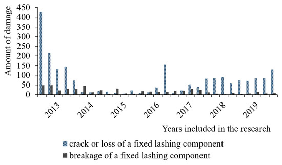 Rail transportation of containers is presumably conducted by flat cars. They are fastened on the frame with fixed lashing components and fittings. During operation, the technological gaps between containers and flat cars cause higher stresses leading to damage of the fixed lashing components and fittings. For example, on the basis of the data collected by Ukrzaliznytsia, the authors determined the amount of damage the fixed lashing components of flat cars suffer in operation [3]. The results of the research are given in Figure 1.