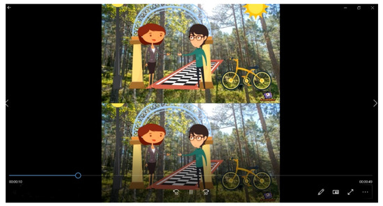 A Panasonic 50 inch 3D plasma TV (TH-P50ST60W, Panasonic Corporation, Osaka, Japan) was selected as the visual display unit. A Mangold Vision eye tracker with a sampling rate of 60 Hz was used to record each participant’s visual performance while watching the videos. Windows Movie Maker was the software used to edit the videos. In order to understand the impact of background on search performance, we used Animaker to design an animation video and a text video. We then inserted landscape photos into the videos with a background, while the original videos had no background. In addition, we inserted five targets that needed to be searched for in each video. To investigate the effect of the difference in arrangement on visual performance, the Open Shot software was used to construct two different arrangements—namely, top-to-bottom and left-to-right arrangements. For the videos arranged top-to-bottom, the video with targets was put on the top; with regard to the videos arranged left-to-right, the video with targets was put on the right. At the same time, in order to reduce the learning effect, the sequence of video presentation was randomized. In this study, the participants watched a 1 min video in each experiment combination, meaning they watched the videos for 8 min (combinations) in total.