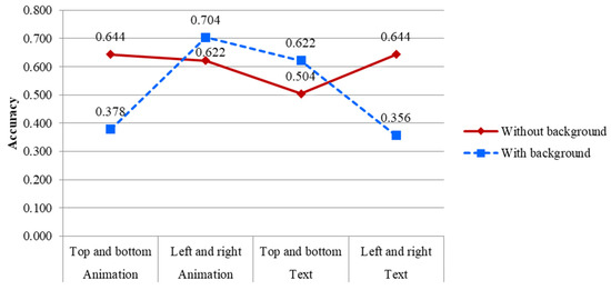 The ANOVA results for accuracy indicated that background (F = 11.599, p < 0.05), video type (F = 10.101, p < 0.05); the interaction between video type and arrangement (F = 11.300, p < 0.05); and the three-way interaction among background, video type, and arrangement (F = 63.325, p < 0.01) were the significant factors. As shown in Figure 3, the performance of accuracy without a background was better in the top-to-bottom animation and the left-to-right text, while the accuracy with a background was superior in the left-to-right animation and the top-to-bottom text. In addition, text with a background in the left-to-right arrangement showed the lowest accuracy. Caroux et al. [8] found that a complex background produced an inferior performance in visual searching. Lin [24] also showed that the horizontal arrangement of phonetic symbols brought about an inferior performance in sending Chinese text messages. A possible reason for this outcome may be that the average scanning distance from left to right is longer than that from top to bottom in a video, especially one with a background, resulting in a low accuracy. In order to see the characters in text clearly, a top-to-bottom arrangement generated a short scanning distance and resulted in a high accuracy. For the interaction between video type and arrangement, as shown in Figure 4, the animation with a left-to-right arrangement and text with a top-to-bottom arrangement had a better accuracy. It can be inferred that a left-to-right arrangement is suitable for animations while a top-to-bottom arrangement is appropriate for texts. Participants may be used to scanning objects on screens from the left to the right in their daily lives, resulting in a high accuracy for left-to-right animation. As previously mentioned, a short scanning distance was found for top-to-bottom text and also resulted in high accuracy. Finally, similar to the results in the three-way interaction, the left-to-right text in Figure 2 showed the lowest accuracy.