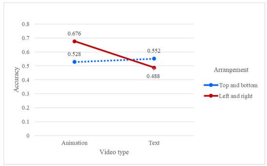 The results further indicated that video type was significant, with the accuracy of the text (M = 0.520) being significantly lower than that of the animation (M = 0.602). As participants have to spend more time in watching and understanding the meaning of texts, it makes sense that the accuracy of texts is lower than that of animation. The results from the interaction between video type and arrangement also showed that watching animation (M = 0.676) produced a higher accuracy than watching text (M = 0.488) in the left-to-right arrangement.