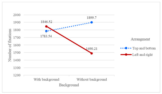 As shown in Table 1, the ANOVA results for the number of fixations indicated that background (F = 4.160, p < 0.05), video type (F = 4.391, p < 0.05), arrangement (F = 6.823, p < 0.05), and the interaction between background and arrangement (F = 5.832, p < 0.05) were the significant factors. For the interaction between background and arrangement, as shown in Figure 5, no significant difference was found with a background in the two arrangements. However, a significant difference (p < 0.05) was found for the two arrangements without a background, where left-to-right arrangement without a background had a small number of fixations. One possible reason for this may be that the participants are used watching left-to-right screens when watching less complex backgrounds, resulting in a lower number of fixations. On the other hand, the top-to-bottom arrangement generated a short scanning distance due to its convenient search from the top down. Although inducing more fixations, participants gave positive comments on it.