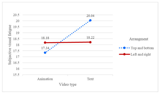 Table 1 shows that background (F = 7.664, p < 0.05), video type (F = 5.827, p < 0.05), and the interaction between video type and arrangement (F = 5.486, p < 0.05) were the significant factors. For the interaction between video type and arrangement, as shown in Figure 6, the subjective visual fatigue for the top-to-bottom arrangement was higher in texts than in animations. The reason for this may be that participants are used to reading from left to right; therefore, not much difference was found compared to the top-to-bottom arrangement. In addition, the top-to-bottom text induced more visual fatigue than the animation. As the participants had to watch texts more closely to distinguish differences, it is reasonable to conclude that watching texts induces more visual fatigue than watching animation.