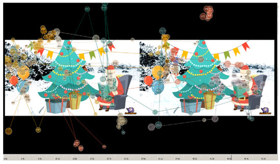 As the scan paths of the two arrangements were differential, we conducted a comparison, which we discuss in this section. As shown in Figure 7, participants mainly conducted the search from the top down, and the scan paths were more concentrated compared to the left-to-right arrangement. As mentioned in Section 3.2, the top-to-bottom arrangement was convenient to scan due to the short scanning distance, which may be the reason the scan paths were more concentrated. On the other hand, participants mainly conducted the search from left to right in Figure 8, and the scan paths were more scattered, with some of them being outside the frame. The reason for this may be that the scanning distance of the left-to-right arrangement is longer than that of the top-to-bottom arrangement, resulting in easier sight deviation and leading to fixation points appearing outside the frame.