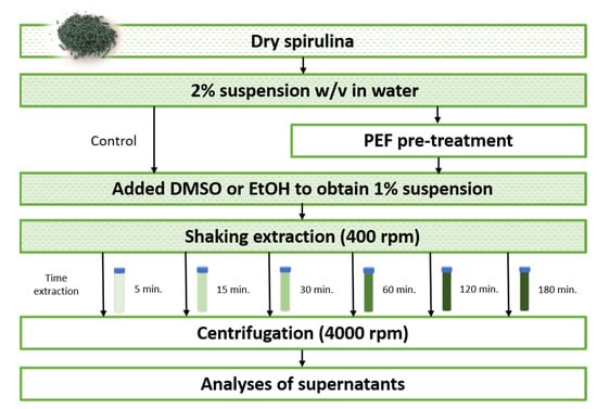 Four samples of 2% (w/v) aqueous suspensions were made from the spirulina dry matter (DM). For this, 198 mL of deionised water were added to 4 g of dry biomass. In two of four samples, the same volume (198 mL) of EtOH or DMSO was subsequently added to finish with a 1% suspension (Figure 1). These two mixtures only received a conventional shaking treatment under stirring. The other 2% suspensions in water were treated with PEF before mixing with the organic solvents. As can be observed in Figure 1, the extracts were obtained from the 1% suspensions at different times and centrifuged to obtain the supernatant to be analysed. A total of 24 extracts were obtained, 12 of which were obtained by conventional extraction and the other 12 by PEF-assisted extraction.