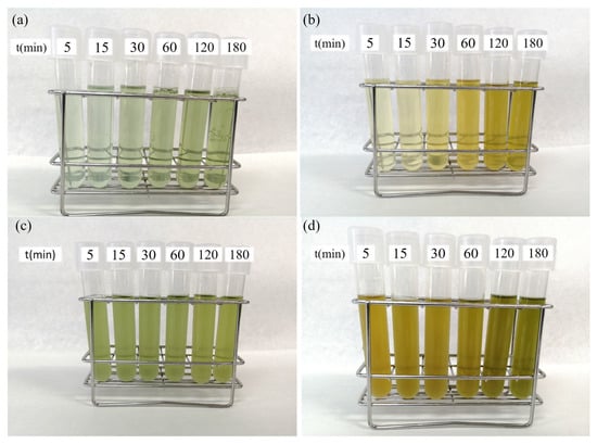 Figure 2 shows the extracts obtained after an extraction using (a) DMSO/H2O or (b) EtOH/H2O at different extraction times (5–180 min) and the extracts obtained after pre-treatment with PEF using (c) DMSO/H2O and (d) EtOH/H2O.