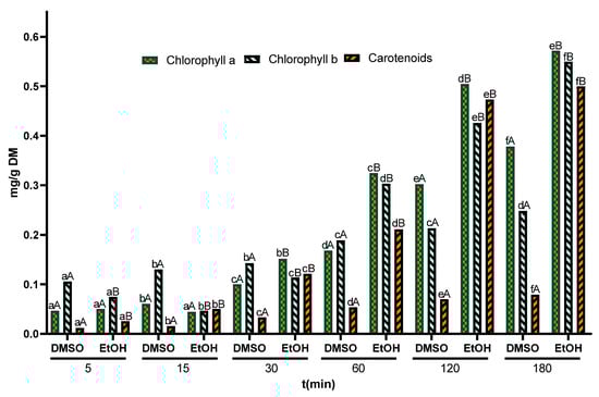 Chlorophyll a, chlorophyll b, and total carotenoids. Conventional extraction (5–180 min) using two binary mixtures (EtOH or DMSO in 50% deionised water). Different lower-case letters in the same parameter and solvent indicate statistical differences as a function of extraction time. Different capital letters in the same parameter and time indicate statistical differences as a function of solvent.