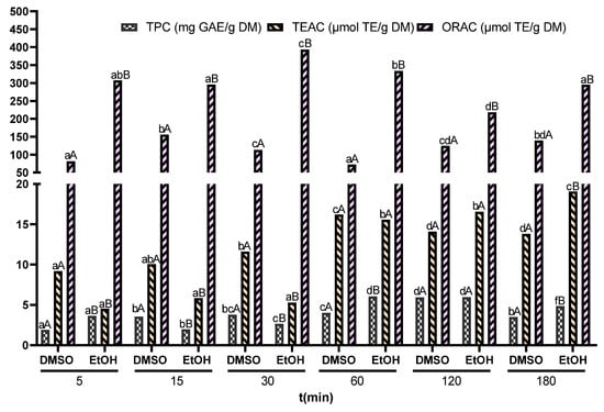 Total phenolic compounds, TEAC and ORAC. Conventional extraction (5–180 min) using two binary mixtures (EtOH or DMSO in 50% deionised water). Different lower-case letters in the same parameter and solvent indicate statistical differences as a function of extraction time. Different capital letters in the same parameter and time indicate statistical differences as a function of solvent.