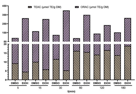 ORAC values ranged from 295.87 ± 19.01 to 393.24 ± 15.28 µmol TE/g DM after using EtOH/H2O and from 72.45 ± 5.95 to 155.95 ± 10.78 µmol TE/g DM when the mixture DMSO/H2O was used. In addition, a greater effect on the extraction of antioxidant compounds was observed at 30 and 180 min, respectively. On the other hand, the TEAC values ranged from 4.52 ± 0.02 to 19.05 ± 1.25 µmol TE/g DM after using the EtOH/H2O mixture and from 9.19 ± 0.62 to 16.19 ± 1.37 µmol TE/g DM with the DMSO/H2O mixture. The maximum value for the TEAC assay (19.05 µmol TE/g DW) was obtained after 180 min extraction and using EtOH 50% as the solvent. The highest ORAC value was also obtained after using EtOH, but after 30 min of extraction (393.24 µmol TE/g DW). Regarding DMSO, the best values for TEAC and ORAC were obtained at 60 min (16.19 µmol TE/g DW) and 15 min (155.95 µmol TE/g DW), respectively. The higher ORAC values are due to other antioxidant compounds not measured in this study, especially fat-soluble compounds such as vitamin E that may have an impact on the antioxidant capacity [38,39,40]. Moreover, ORAC sensitivity for other antioxidant compounds should also be taken into account [34].