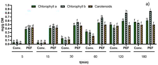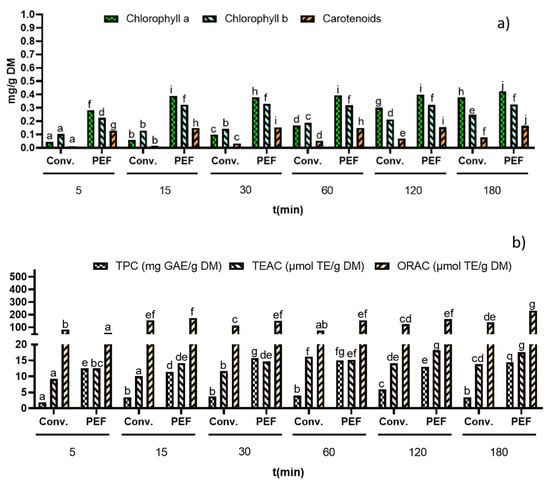 Chlorophyll a, chlorophyll b, and carotenoid content (a); TPC, TEAC, and ORAC (b) after conventional extraction and PEF-assisted extraction with EtOH/H2O. Different lower-case letters in the same parameter indicate statistical differences depending on the extraction time or treatment used.