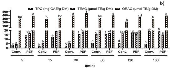 Chlorophyll a, chlorophyll b, and carotenoid content (a); TPC, TEAC, and ORAC (b) after conventional extraction and PEF-assisted extraction with DMSO/H2O. Different lower-case letters in the same parameter indicate statistical differences depending on the extraction time or treatment used.