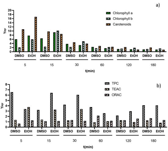 However, it should be noted that this was not verified for all the compounds evaluated. For example, when using the solvent EtOH/H2O, no significant differences were found in the chlorophyll a content after 5 and 15 min of extraction. Moreover, no statistically significant differences in chlorophyll b content were observed after 15 and 30 min of extraction with the solvent DMSO/H2O. When analysing the statistical results between solvents, no differences were found in chlorophyll a extraction after 5 and 15 min of extraction.