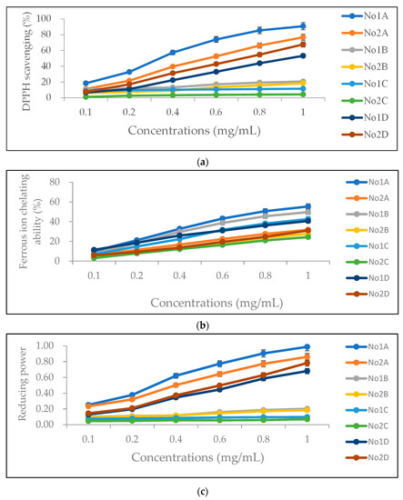 DPPH radical scavenging activity (a), ferrous ion chelating ability (b), and reducing power (c) of the extracts obtained with different solvents from No. 1 and No. 2. No. 1A and No. 2A are ethanol extracts, No. 1B and No. 2B are ethyl acetate extracts, No. 1C and No. 2C are n-hexane extracts, and No. 1D and No. 2D are pure-water extracts.