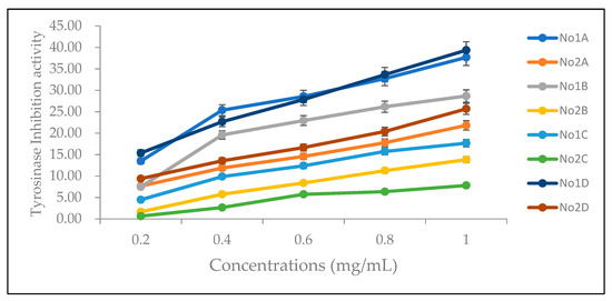 The whitening abilities of the four solvent extracts of the two types of Hang Ju were evaluated and compared based on the tyrosinase inhibitory activities (Figure 2) of 0.1–1.0 mg/mL extracts. The highest tyrosinase inhibitory activity was obtained with distilled water as the solvent, followed by ethanol and ethyl acetate. The lowest tyrosinase inhibitory activity was obtained with n-hexane (p < 0.05 for all solvents) (Table 4). The tyrosinase inhibitory activities of all four extracts of No.1 were significantly higher than those of No. 2 (p < 0.001 for all solvents). Among all extracts, the highest tyrosinase inhibitory activity was observed in No. 1D, followed by No. 1A. The lowest tyrosinase inhibitory activity was observed in No. 2C.