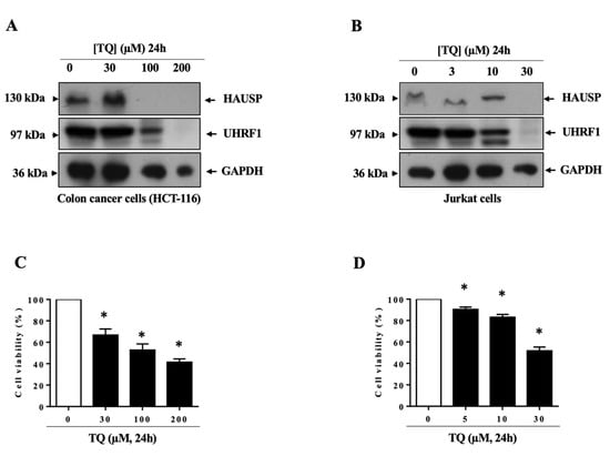 We then investigated whether UHRF1 ubiquitination is a common feature of TQ in cancer cells and whether this process involves the downregulation of HAUSP by evaluating the effects of TQ in two human cancer cell lines that highly express UHRF1: human colon cancer cells (HCT-116) [,] and Jurkat cells [,,]. TQ induced a sharp decrease in the expression of UHRF1 and HAUSP at the protein level when administered at concentrations of at least 200 µM in HCT-116 cells (Figure 1A) and 30 µM in Jurkat cells (Figure 1B). The anti-proliferative effect of TQ in HCT-116 cells (Figure 1C) and in Jurkat cells (Figure 1D) was then analyzed under the same experimental conditions. Cell proliferation in response to TQ was decreased in a concentration-dependent manner in both cancer cell lines. TQ significantly inhibited cell proliferation starting from 30 μM in HCT-116 cells and the inhibition percentage reached approximately 50% at 100 μM, suggesting that TQ exerts its inhibitory effects on HCT-116 cells with an estimated half-maximal effect (IC50) value of approximately 100 μM (Figure 1C). In Jurkat cells, TQ significantly inhibited cell proliferation from 5 μM, with an IC50 value of approximately 30 μM (Figure 1D).