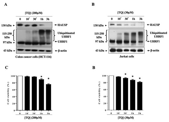 A kinetic analysis of the effects of TQ on UHRF1 expression, using concentrations at which UHRF1 became undetectable, 200 µM of TQ in HCT-116 cells (Figure 2A) and 30 µM in Jurkat cells (Figure 2B), revealed time-dependent effects of TQ on UHRF1 ubiquitination, as reflected by the appearance of high-molecular-weight bands of UHRF1 at 115 and 250 kDa, rather than the expected one at 97 kDa. The TQ-induced UHRF1 ubiquitination was associated with a decrease in the expression of HAUSP, detectable at 10 min in HCT-116 cells (Figure 2A) and Jurkat cells (Figure 2B) in parallel with the appearance of high-molecular-weight bands on UHRF1. The TQ-induced downregulation of UHRF1 and HAUSP was also associated with an upregulation of the p73 tumor suppressor protein in both cancer cell lines (data not shown). The anti-proliferative effect of TQ in HCT-116 cells (Figure 2C) and Jurkat cells (Figure 2D) was also analyzed under the same experimental conditions. TQ induced a time-dependent cell proliferation inhibition in HCT-116 cells (Figure 2C) and Jurkat cells (Figure 2D) and this effect was associated with the TQ-induced UHRF1 ubiquitination. Indeed, TQ caused a significant decrease in cell proliferation after 1 h and 30 min in HCT-116 cells (Figure 2C) and Jurkat cells (Figure 2D), respectively.
