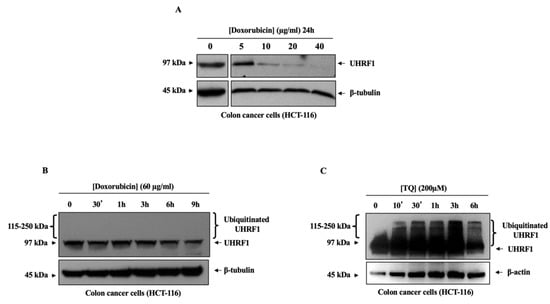 The same findings were observed in HCT-116 cells treated with doxorubicin (Figure 4). Figure 4A shows that the treatment of colon cancer cells with doxorubicin resulted in a dose-dependent decrease in the protein expression level of UHRF1, with concentrations as low as 10 µg/mL. The time-course effects of 60 µg/mL of doxorubicin on UHRF1 expression showed a decrease in the expression of UHRF1 starting at 6 h (Figure 4B). Again, the doxorubicin-induced UHRF1 downregulation was not correlated with the ubiquitination process, as reflected by the lack of high-molecular-weight bands of UHRF1 (Figure 4B), as was observed in response to TQ (Figure 4C).