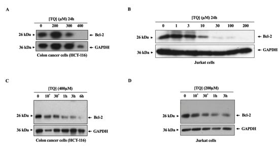 The B-cell lymphoma 2 (Bcl-2) oncogene is overexpressed in several tumors, including colon cancer [,,,] and Jurkat cells [,,]. Bcl-2 was shown to be degraded in the proteasome through a ubiquitination pathway in response to several signals [,]. We investigated whether Bcl-2, like UHRF1, also underwent fast ubiquitination before its degradation in response to TQ in colon cancer cells and Jurkat cells. Dosage analysis of TQ on the expression of Bcl-2 in both cancer cell lines revealed that the treatment of HCT-116 cells (Figure 5A) and Jurkat cells (Figure 5B) with TQ induced a dose-dependent decrease in the protein level expression of Bcl-2, starting at 300 µM TQ in HCT-116 cells (Figure 5A) and at 10 µM in Jurkat cells (Figure 5B). A kinetic analysis of TQ was then conducted on Bcl-2 expression in HCT-116 cells, using 400 µM TQ (Figure 5C) and 200 µM TQ in Jurkat cells (Figure 5D), concentrations at which Bcl-2 became undetectable after 24 h of treatment in HCT-116 cells (Figure 5A) and Jurkat cells (Figure 5B). The time-course effects on Bcl-2 expression showed that TQ induced a decrease in the expression of Bcl-2 beginning at 1 h in HCT-116 cells (Figure 5C) and at 30 min in Jurkat cells (Figure 5D). However, Western blot analysis revealed no high-molecular-weight bands of Bcl-2 in TQ-treated HCT-116 cells (Figure 5C) or Jurkat cells (Figure 5D), indicating that, unlike its effects on UHRF1, TQ did not induce the fast ubiquitination of Bcl-2 in cancer cells.