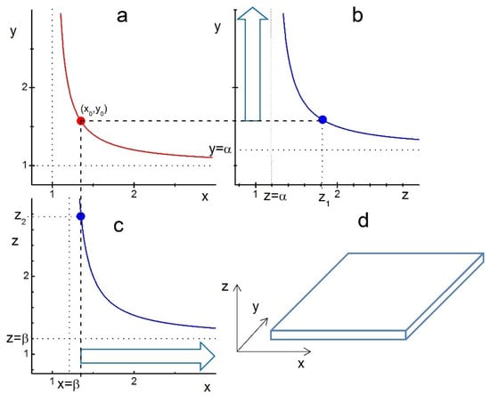 Illustration of ligand-assisted growth of a nanoplatelet from an ideal cuboid crystal and anisotropy of the LCN sizes and . The curves represent the boundary functions given by Equation (10): (a) , (b) , and (c) with parameters . The points , and on the corresponding curves indicate the formation of compact layers of ligands on the xy, zy and xz facets, respectively. The compact layer of ligands is supposed to be formed first at the point . Therefore, the z-edge of the crystal at this point has to be significantly lower than . (b) The vertical arrow indicates the growth of the crystal’s y-edge for . (c) The horizontal arrow indicates the growth of the crystal’s x-edge for . (d) Nanoplatelet-like shape of the crystal growing with after its xy-facet is covered with a compact layer of ligands.