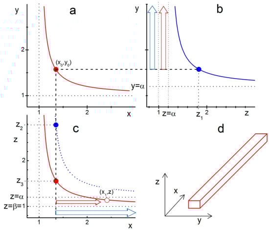 Illustration of ligand-assisted growth of a nanowire from model cuboid crystal with the anisotropy of LCN sizes and . The curves represent the boundary functions given by Equation (10): (a) , (b) , and (c) with the parameter values . The points , and on the corresponding curves indicate the formation of a compact layer of ligands on the xy, zy and xz facets, respectively. The compact layer of ligands is supposed to be formed first at point ; therefore, the z-edge of the crystal at this point has to be significantly lower than . Blue arrows in (b,c) indicate the growth of nanoplatelets with similar to those in Figure 1. Red arrows in (b,c) indicate the growth of nanowires with , as in this z-range, the x-edge of the crystal grows until it reaches the red line at the point , indicating that the crystal’s xz-facet gets covered with a compact layer of ligands thus fixing the y-edge length. (d) A nanowire-like shape of the crystal growing with after its xy- and xz-facets are covered with a compact layer of ligands. For , the growing x- and y-edges would intercept the corresponding border lines (blue in (b) and red in (c)) and form a finite-sized cuboid.