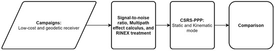 The methodology applied for this research is presented in Figure 1. First, the observations with the low-cost GNSS receiver and the geodetic receiver were made at different dates, but it was considered that the same day and time should be used with the aim to maintain similar conditions. Second, the value of the signal-to-noise ratio (SNR) and multipath (MP) were extracted to inspect the intensity of the received signal and the influence of the multipath effect on the observations at a sampling frequency of 0.1 and 0.2 s (original sampling rate) for the low-cost GNSS receiver and geodetic receiver, respectively. Likewise, the treatment of the RINEX [34] files was performed with TEQC (translate/edit/quality check) software [35] in order to obtain different sampling rates for the proposed comparative analysis. Third, the data were processed using the PPP method in the online software CSRS-PPP [36,37] considering the static and kinematic mode according to the observation epoch. Finally, the comparison was made considering the difference between the precise coordinates obtained from a previous survey campaign [20], processed using the Trimble Business Center software [38], and estimations derived from the CSRS-PPP software. Coordinates obtained from a previous survey from a geodetic receiver were taken as a reference, wherein the lower the difference the better the behavior was deemed to be [21]. Additionally, the precision reached was considered for the comparison.