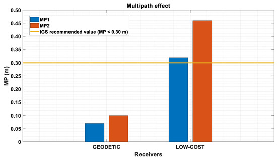Multipath effect for the low-cost and geodetic GNSS receivers. Yellow line: IGS recommended value (MP < 0.3 m).