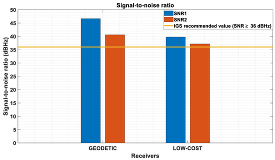 As was mentioned earlier, the calculation of the multipath effect (Figure 4) and signal-to-noise ratio (Figure 5) were made using the TEQC software for the low-cost GNSS and geodetic receivers at 0.1 and 0.2 s, respectively. In [40], it is mentioned that the multipath effect is inversely proportional to the signal-to-noise ratio, this is found in Figure 4 and Figure 5. The low-cost GNSS receiver registered a high value of the multipath effect in both frequencies compared to the IGS recommended value of 0.3 m, this was despite the fact that the low-cost GNSS receiver does not have a polarized antenna to reduce the multipath effect. Nevertheless, a normal value of the multipath effect was registered in general terms compared to the mean global value of the multipath effect in IGS stations [41,42]. Despite the good behavior presented in the signal-to-noise ratio for the low-cost GNSS receiver, the multipath effect obtains high values in contrast to the value recommended by IGS and the geodetic receiver.