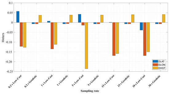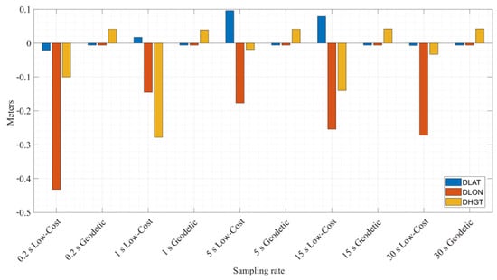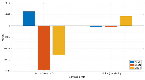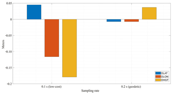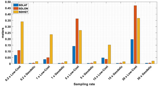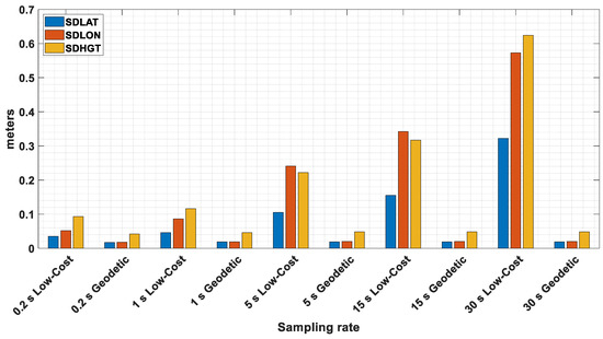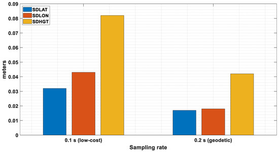 Nonetheless, when the low-cost GNSS receiver was set up to 0.1 s, the results of the difference between the estimated and precise positions (Figure 12) and the standard deviation (Figure 13) are greater than the geodetic receiver.