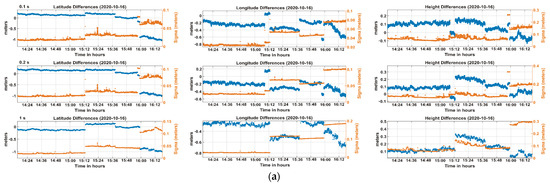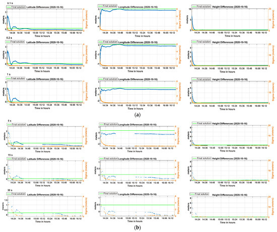 Low-cost GNSS static mode obtained by processing with CSRS-PPP: (a) sampling rate: 0.1, 0.2 and 1 s; (b) sampling rate: 5, 15 and 30 s.