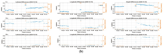 Low-cost GNSS kinematic mode obtained by processing with CSRS-PPP: (a) sampling rate: 0.1, 0.2 and 1 s; (b) sampling rate: 5, 15 and 30 s.