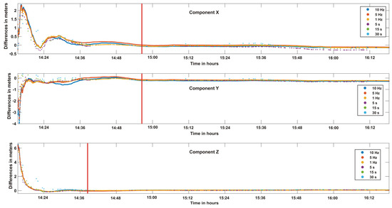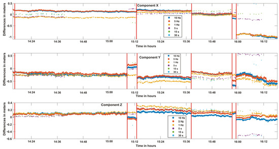 The PPP-kinematic mode was the most affected mode due to the data loss (Figure 15). This data loss generated an offset in the difference, between estimated and precise positions in the time series. In this sense, the kinematic mode was more affected than the static mode due to the data loss at low frequencies, being more affected at > 5 s sampling rates. The obtained solution at 0.1 s seemed to have linear behaviors as with the rest of the solutions obtained. Nevertheless, as the sampling rates diminished, an offset is seen at the same time in all cases. Apparently, at 30 s the solution obtained was not affected by the data loss due to the linear behavior of the time series.