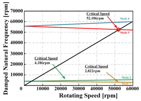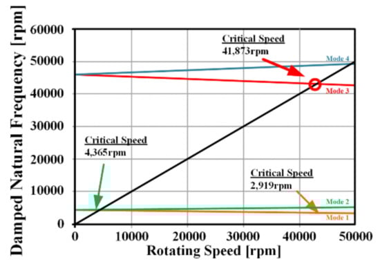 where is the mass, is the gyroscopic, is the stiffness matrix, is the displacement, and is the vector component of the force. The rotating body can be classified into rigid body mode and bending mode according to its shape, and the design should be developed avoiding the bending mode as much as possible. Generally, the resonant frequency at the critical speed is predicted using the Campbell diagram.
