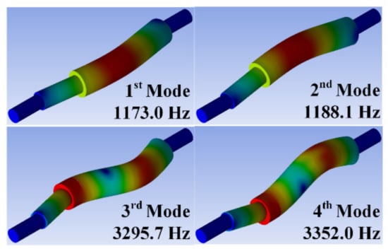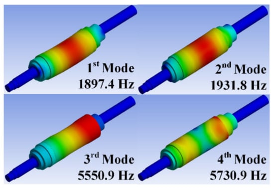 With the rotational speed as the horizontal axis and the natural frequency as the vertical axis, the intersection of the rotational speed and the natural frequency can be identified as the resonance area. Figure 2 shows the critical velocity analysis result of the STS420-J2 shaft material through FEM using the value derived from Equation (1). Consequently, the critical speed closest to the rated speed was 41873 rpm. Since modal analysis directly affects the electromagnetic and mechanical vibration of a rotating machine, it is important to check the natural frequency and mode shape. Figure 3 shows the results of modal analysis when rotating at rated speed. At the rated speed of 36,000 rpm, the resonant frequencies are 1173 Hz and 1188.1 Hz in the 1st and 2nd modes respectively, and the resonant frequency intersection occurs at 3295 Hz and 3352 Hz in the 3rd and 4th modes. Frequency means the natural vibration frequency according to each mode, and rigid body mode and bending mode occur at similar frequencies. Therefore, the frequency is derived differently according to the rigid body mode and the bending mode. However, as a result of the analysis, it was confirmed that there was no problem in the design of the rotating body because there was no bending mode intersection at the rated speed.