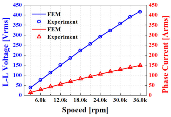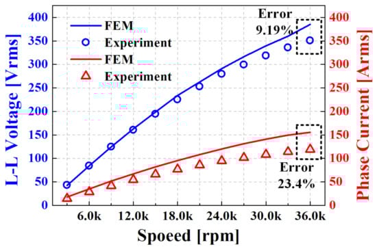 After ensuring the mechanical stability of the PMSG rotating at high speed, a design that satisfies the rated requirement output of 100 kW and line-to-line voltage of 380 Vrms was developed. Subsequently, to verify the validity and reliability of the designed generator, a high-speed PMSG was manufactured, and an experiment was conducted. Figure 4 and Table 2 shows a comparison of the FEM and experimental results of the manufactured high-speed generator.