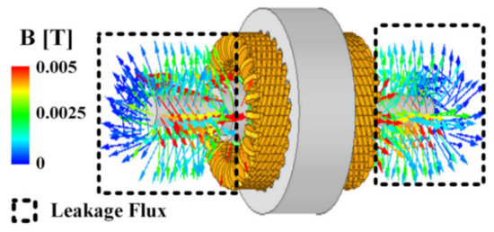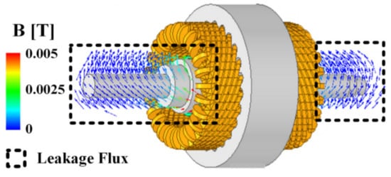Previously, PMSG using the STS420-J2 shaft material was confirmed to have a problem in that the requirements were not satisfied because of the inductance leaking into the shaft as it was transformed into ferromagnetic characteristics during the heat treatment process of the rotating body. Therefore, a design that satisfies the requirements was performed using Inconel 718, which has a non-magnetic characteristic for the shaft material. The magnetic flux leakage through the shaft after the heat treatment of the rotor was confirmed through FEM. This is shown in Figure 6, and it was confirmed that magnetic flux leakage through the shaft hardly occurred.