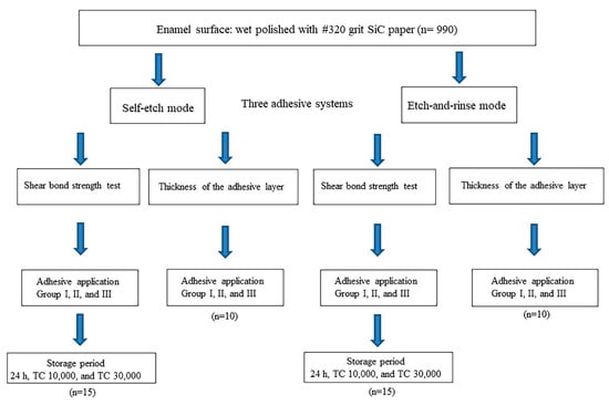 This study aimed to investigate the effect of the adhesive application method on the durability of the enamel bond and the thickness of the adhesive layer using the new two-step adhesive system and compare it with those of the conventional two-step self-etch adhesive systems. The null hypotheses were as follows: (i) the enamel bond durability of the universal adhesive-derived two-step adhesive system (under thermal stress) would vary with the different application methods used, and (ii) the trend of enamel bond durability based on the different application methods used would not differ from those observed using the tested conventional two-step adhesive systems.