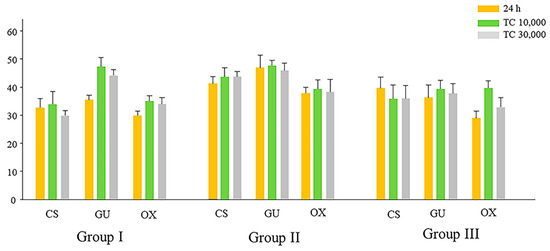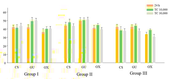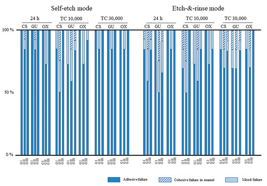 The mean SBS values in the SE mode ranged from 38.4 to 48.3 MPa in CS, 38.0 to 51.6 MPa in GU, and 30.9 to 44.9 MPa in OX. All the adhesives showed higher SBS values in Group II than in Groups I and III, regardless of the storage period (Table 4). In particular, the SBS values of all three adhesives at TC 10,000 in Group II were significantly higher than at the other storage periods in Groups I and III, except for GU at TC 10,000 and TC 30,000 in Group I. In Group I, although no significant differences in SBS values were observed among the storage periods in the case of CS, GU and OX presented with significantly higher values after TC than at 24 h (Table 4). In Group II, no significant differences among the storage periods were observed in the cases of CS and GU. Similarly, no significant differences among the storage periods were observed in the case of CS in Group III; however, GU and OX presented with significantly lower SBS values at TC 30,000 than at the other storage periods. The SBS values in OX were significantly lower than in the other adhesives during most of the storage periods, regardless of the application group (Table 4). Furthermore, GU and OX showed significantly higher SBS values in the ER mode at 24 h than in the SE mode. However, no significant differences in the SBS values of the three adhesives were observed between the SE and ER modes at TC 30,000 in Group III.