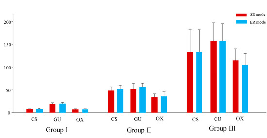 Figure 7, Figure 8 and Figure 9 show representative resin/enamel interfaces. All the adhesive systems showed excellent adaptation between the adhesive layer and the decalcified enamel substrate in both etching modes. No clear differences were observed in the thickness of the adhesive layer in the different etching modes, regardless of the adhesive system or application method used. In Group I (Figure 7), the thickness of the adhesive layers in CS and OX were similar (approximately 10 μm), but GU presented with twice the thickness of the other adhesive systems. In Groups II and III (Figure 8 and Figure 9), the thickness of the adhesive layers in CS and GU were similar and higher than that in OX. In the ER mode, the smear layer was completely dissolved, and adhesive interpenetration with enamel as resin tags was clearly observed, regardless of the adhesive system or application method used. On the contrary, enamel resin tags were not clearly seen in the SE mode, regardless of the adhesive system or application used. Part of the smear layer remained on the treated surface and created a hybrid layer (Figure 7C, Figure 8C and Figure 9A,C,E), which was infiltrated by the resin monomers in some instances. The ultrastructure of the adhesive layer was dependent on the adhesive system used. Unlike CS and GU, somewhat larger irregular fillers (approximately 0.1–0.5 μm in size) and nano-sized fillers were observed in OX. The thickness of the adhesive layer differed with the different adhesive systems and application methods used.