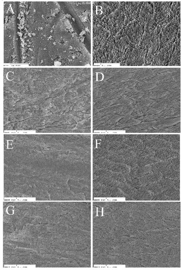 Representative SEM images of the treated enamel surface. (A) Ground with SiC paper #320 (×5000). (B) Phosphoric acid etching for 15 s (×5000). (C) CS in SE mode (×5000). (D) CS in ER mode (×5000). (E) GU in SE mode (×5000). (F) GU in ER mode (×5000). (G) OX in SE mode (×5000). (H) OX in ER mode (×5000).