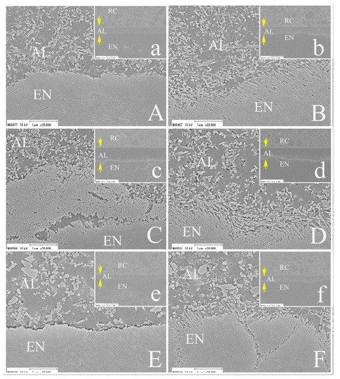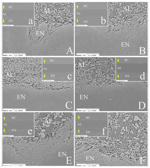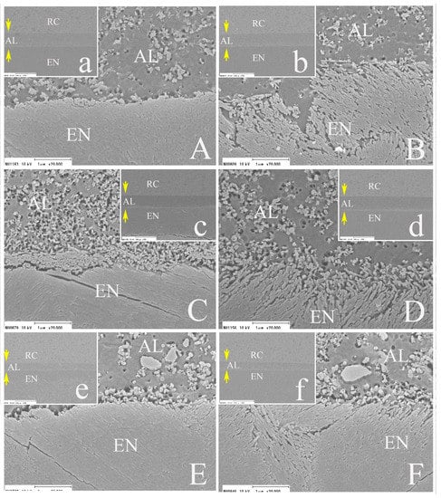 Representative SEM images of resin/enamel interfaces (Group II). (A) CS in SE mode (×20,000, ×1000). (B) CS in ER mode (×20,000, ×1000). (C) GU in SE mode (×20,000, ×1000). (D) GU in ER mode (×20,000, ×1000). (E) OX in SE mode (×20,000, ×1000). (F) OX in ER mode (×20,000, ×1000). AL: adhesive layer, EN: enamel, RC: resin composite. The yellow arrows indicate the adhesive layer.