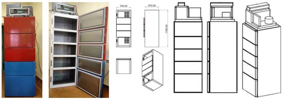The technological challenge was to develop and design prototype external bodies for refrigeration and freezing modules. The role of the body was to provide protection of the refrigeration system elements from the influence of external factors, as well as from their destruction. The work has been carried out in the following steps: selection of an insulator, sealant, and lining material for the inside of the box; the construction of the cabinet bodies, taking into account individual components (their location); execution of the bodies (filled with a specific insulator) with the required physical properties. The development of the systems for cooling and freezing modules, as well as the execution and verification of their operation took place in the following stages: first, the cooling systems (including condensate drainage) with automation and control and the electrical installations for the cooling and freezing modules were designed and executed; next, their operation was verified in model conditions and in real environmental conditions. Prototypes of the bodies of modules (cooling and freezing) of the MainBox device were built of stainless steel with space inside for cooling and other necessary installations, including measuring instrumentation and operating the customer’s access system to a given box (Figure 1). Cooling and electrical installations with measuring and control instrumentation were located in the upper part of MainBox body. The module consisted of 5 chambers (boxes) for food storage. Each box was opened at the front with a separate door.