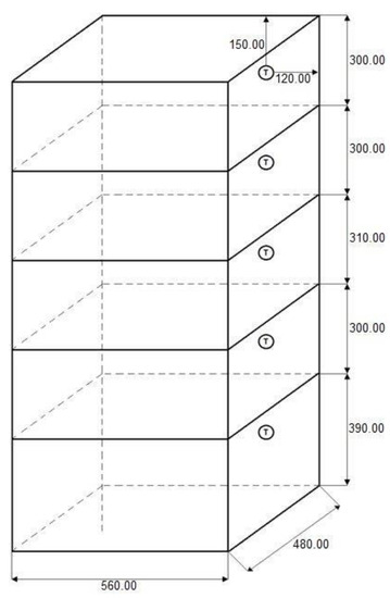 The conditions for storing products in prototype cooling and freezing devices were monitored. For this purpose, the optimal arrangement of temperature sensors in each MainBox chamber and the system for the continuous recording of these parameters were designed. The diagram of the device with the location of these sensors and every box internal dimensions is shown in Figure 2. In each box, the sensor was placed in the upper right corner, 15 cm from the top edge and 12 cm from the side edge. Monitoring the temperature inside the MainBox was possible through the developed and installed temperature recording system. The temperature was recorded for every 2 min through 48 h in 5 iterations.