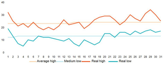 The operation of the cooling and freezing modules was tested in real weather conditions in the city of Lodz, Poland in July 2019, and the temperatures during this period are shown in Figure 3.