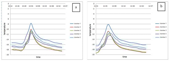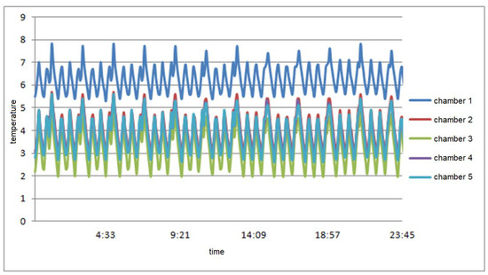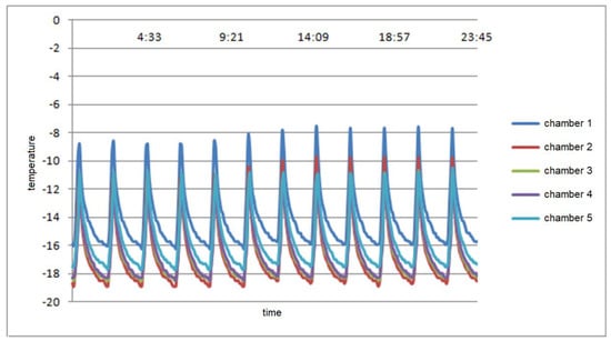 Monitoring of the temperature inside the MainBox was possible with the developed and installed system of its recording with the optimal arrangement of sensors. The measured temperatures of individual boxes of the cooling and freezing modules (numbering of chambers from the top of the module, as shown in Figure 2) were within the ranges given in Table 1. Temperature readings were with the accuracy ±0.1 °C. An exemplary record of the internal temperatures monitoring in the chambers of the cooling and freezing modules recorded temperature amplitude of approximately 3 °C and 6 °C, respectively (Figure 4 and Figure 5). Thus, the designed and manufactured prototype devices with the necessary installations made it possible to maintain appropriate temperature conditions in the empty chambers.