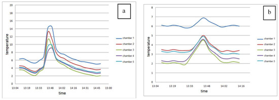 Temperature monitoring in the boxes of the cooling module during insertion of food products (a) or removal of food products (b).
