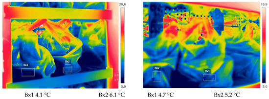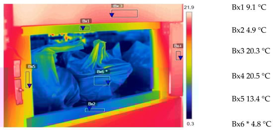 The temperatures of the stored food in the prototype module, after 24 h of storage, were acceptable (Figure 10 and Figure 11). Thermovision made it possible to show the places where modules were modified (leaks removed), the energy losses were lower, which translated into financial savings during operation and benefited for the natural environment (lower amount of carbon dioxide emissions). Such action made the developed innovative devices more attractive for food distributors, as appropriate storage conditions were ensured with lower operating costs.