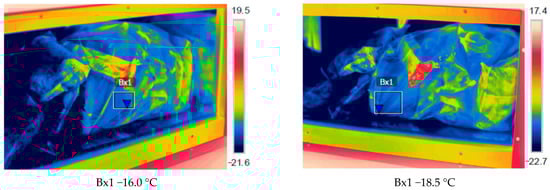To identify thermal anomalies for all filled chambers of the cooling and freezing module immediately after storage, thermal imaging studies were carried out. The exemplary thermograms for chamber 2 in these modules are shown in Figure 8 and Figure 9. The obtained results confirmed that the temperatures were kept at the required level in accordance with the specifications of the project.