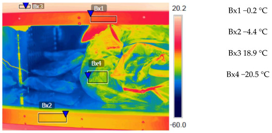 The tightness control of cooling and freezing modules filled with food products packed in collective packaging was carried out using the FLIR T1020 thermal imaging camera (Figure 10 and Figure 11). The maximum time the products remained in the chambers until they were picked up by customers was set at 24 h. During the tests, the recorded ambient temperature was 23 °C.